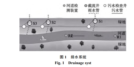 本次研究區(qū)域為日市主城區(qū)內的部分河段全長 310m,南北走向,地處亞熱帶區(qū)域,年降雨量在1400~2 000mm,最大徑流量出現(xiàn)在5至9月。河寬為 20~30 m,河道平緩,流速低,河道常水位 3.0 m,水深常年穩(wěn)定在 1.5 m左右,河道東岸人口密集,以住宅區(qū)和餐飲行業(yè)為主。河道東岸沿河鋪設截污管道,東岸管徑800mm,管道流向由北向南。雨水管由市區(qū)內通向河道,通過管道末端設置截流井連接河道排口,見圖1。