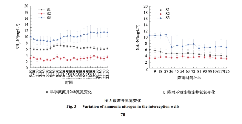 三口井中 S2 在 24h內處于穩(wěn)定波動狀態(tài),與時間無明顯關聯(lián),其余井均有一定關聯(lián)性。S1在6:50 至 14:50 之間濃度較其余時間段高,該段時間為白天生產生活高峰期,用水量較大,可能存在部分污水進入雨水管中使其氨氮上升。S3在16:50至 23:50 時,氨氮逐漸從 10 mg 上升為 11 mg,此時段夜問餐飲廢水增多,易從地面集水口中進入雨水管。S1、S3 兩者在凌晨時段氨氮均有小幅下降,該時間段為生活用水低谷期,產生污染減少。同時監(jiān)測小型降雨不發(fā)生溢流時截流井內水質監(jiān)測,觀察降雨2h內其變化,發(fā)現(xiàn)在降雨前期,氨氮濃度較穩(wěn)定且部分點位出現(xiàn)上升,說明初期雨水存在一定污染,并未稀釋井內水體,甚至加重污染在降雨中后段時,S1氨氮逐漸在雨水稀釋下變低;S2由于井內濃度并不高,因此受雨水影響較小,呈波動狀;S3井內濃度先下降后上升,可能是因為在雨水稀釋下濃度下降,但匯水區(qū)域遠處來水二次沖刷又帶來污染。
