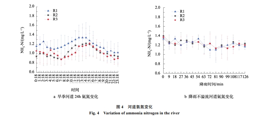 從河道上中下 3個點位的旱季 24h 水質變化圖及小型降雨不溢流水質圖中看出,三點的氨氮濃度相差不大,基本低于 1.5 mgl,符合Ⅳ類水氨氨要求旱季時在 7:18 至 14:18 時段內,氨氮有所上升該區(qū)域內部無顯著點源污染,可知氨氮濃度主要受上游來水影響,上游來水污染影響該區(qū)域氨氮水平。降雨時發(fā)現(xiàn)三點氨氮濃度更為接近,且隨降雨時間增長有小幅下降,可知降雨時段內,河道流速增大,加速氨氮的對流擴散,使全河段濃度趨于統(tǒng)一值,降雨過程加長,使得河道水體被逐漸稀釋,氨氮緩慢下降。