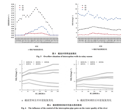 同時三口井內氨氮會隨著降雨時間的增長而逐漸降低,當在線監(jiān)測氨氮降為 1.5 mg幾 以下時,即可控制閘門關閉,使雨水直排,減少污水管網(wǎng)負擔。由上可知,設置截流管閘并對其進行相應調控能有效截流旱季與雨季不溢流時污染,并減輕溢流時對河道的污染。同理,在不同河道段和其他降雨情況下,基于前期數(shù)據(jù)獲取,可以推得多個截流井溢流時的調控方案。