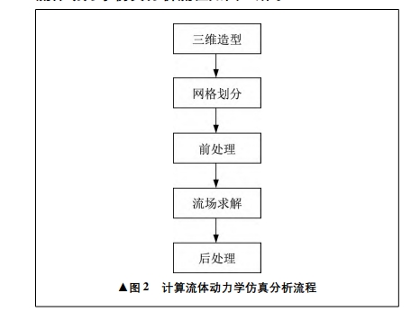 一體化預(yù)制泵站內(nèi)部的流態(tài)優(yōu)劣取決于污水泵進(jìn)水口的入流條件。在污水泵提升污水時(shí),應(yīng)用計(jì)算流體動(dòng)力學(xué)方法分析一體化預(yù)制泵站筒體內(nèi)部的流場(chǎng),以此來觀察泵站的運(yùn)行流態(tài)。筆者采用國際上運(yùn)用廣泛的 ANSYS 有限元分析軟件,對(duì)一體化預(yù)制泵站進(jìn)行計(jì)算流體動(dòng)力學(xué)仿真分析,過程主要包括三維造型、網(wǎng)格劃分、前處理、流場(chǎng)求解、后處理五個(gè)階段!。計(jì)算流體動(dòng)力學(xué)仿真分析流程如圖2所示。