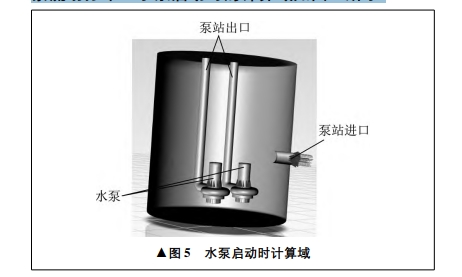 采用 ANSYS CFX 流體分析及仿真軟件對(duì)一體化預(yù)制泵站內(nèi)部流動(dòng)進(jìn)行計(jì)算流體動(dòng)力學(xué)仿真分析。根據(jù)泵站內(nèi)部流體流動(dòng)的特點(diǎn)和對(duì)計(jì)算結(jié)果收斂性的預(yù)期,將泵站進(jìn)口流速設(shè)置為恒定速度,將出口流速設(shè)置為自由流出,葉輪與靜止部件間的交界面設(shè)置為轉(zhuǎn)子凍結(jié),其余固體壁面均設(shè)置為光滑無滑移壁面條件,同時(shí)開啟兩臺(tái)水泵進(jìn)行計(jì)算流體動(dòng)力學(xué)仿真分析,觀察流場(chǎng)分布。水泵啟動(dòng)時(shí)的計(jì)算域如圖 5 所示。