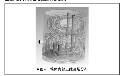 筒體內(nèi)部三維流場(chǎng)分布如圖6所示。通過泵站在啟動(dòng)狀態(tài)下筒體內(nèi)部三維流線及速度矢量分布,可以看出水流從泵站進(jìn)口流入后,均勻流向水泵兩側(cè),水泵吸入口的入流未出現(xiàn)明顯湍流現(xiàn)象,水泵吸入口附近流速較大,具備較強(qiáng)的抽吸力。