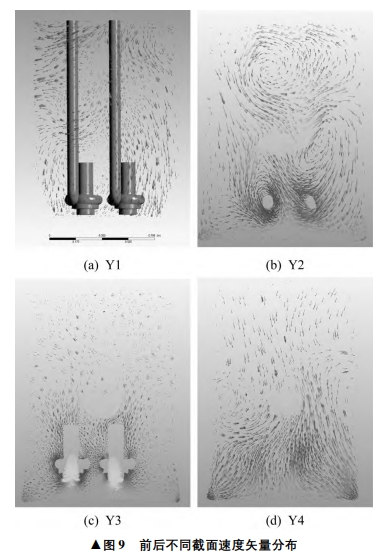 為了更仔細(xì)地觀察筒體底部流場(chǎng),分別在筒體內(nèi)部前后不同位置設(shè)置截面,查看流線和矢量分布。前后不同位置截面如圖7所示,從前往后依次為Y1~Y4截面。前后不同截面流線圖如圖8所示,速度矢量分布如圖9所示。