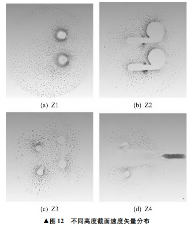 筒體內(nèi)不同高度截面如圖10 所示,從下往上依次為 Z1~Z4 截面。查看不同高度截面上的流線及矢量分布,不同高度截面流線圖如圖 11所示,不同高度截面速度矢量分布如圖 12 所示: